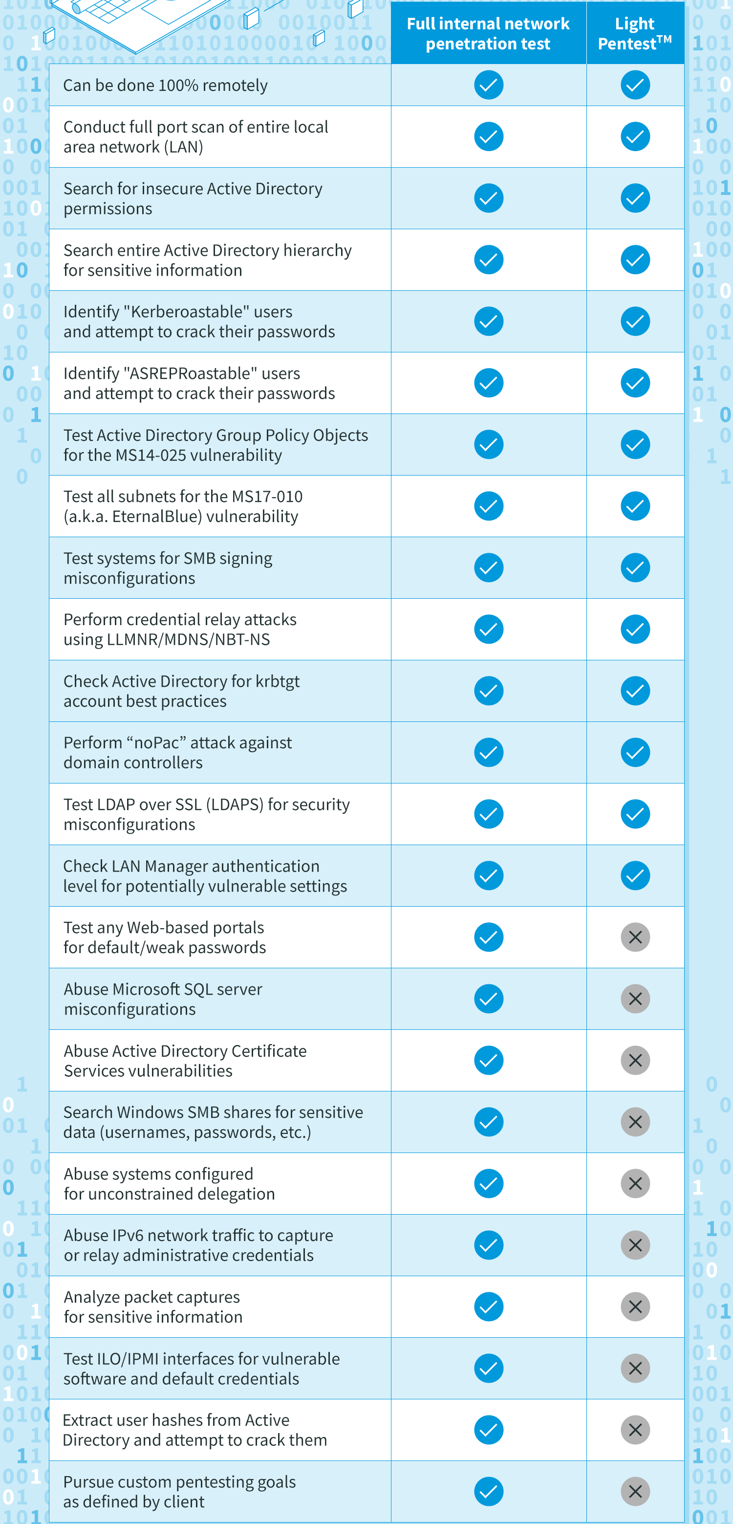 With Light Pentest™, we attempt to find as much “hacker low-hanging fruit” as we can in about half the hours (roughly a 3-day engagement). This means that Light Pentest™ is great for companies who have never had a penetration test, or who have wanted one but did not have the budget for it.